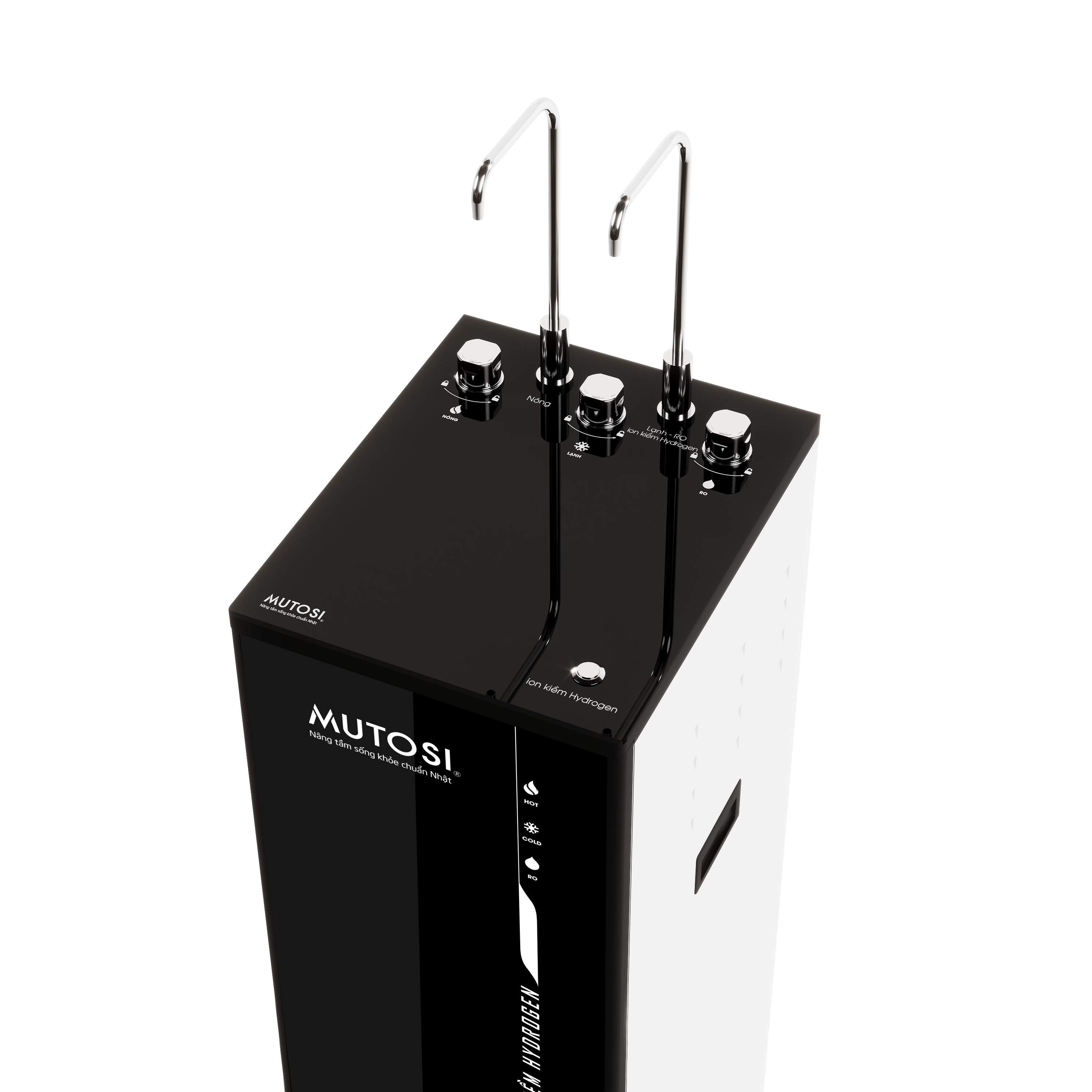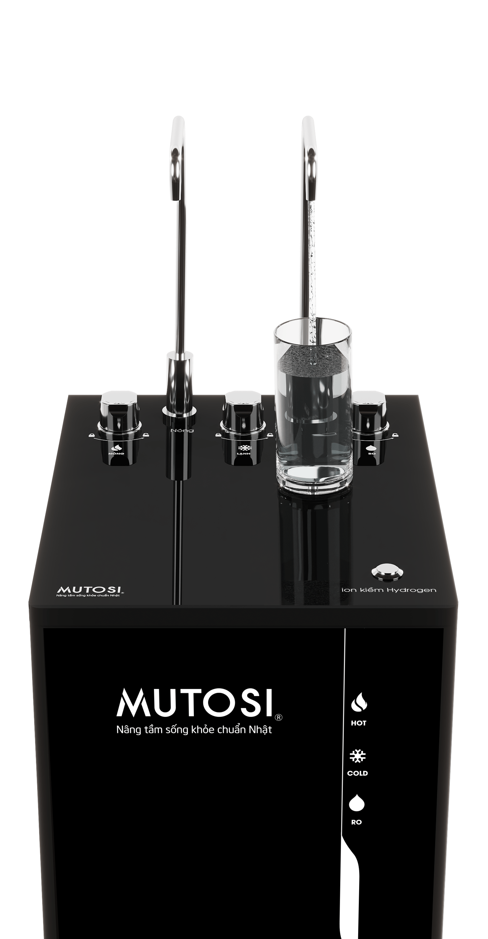 - 1 vòi lấy nước RO nguội; nước RO đã được làm lạnh (6-12°C) hoặc nước ion kiềm Hydrogen khoáng.