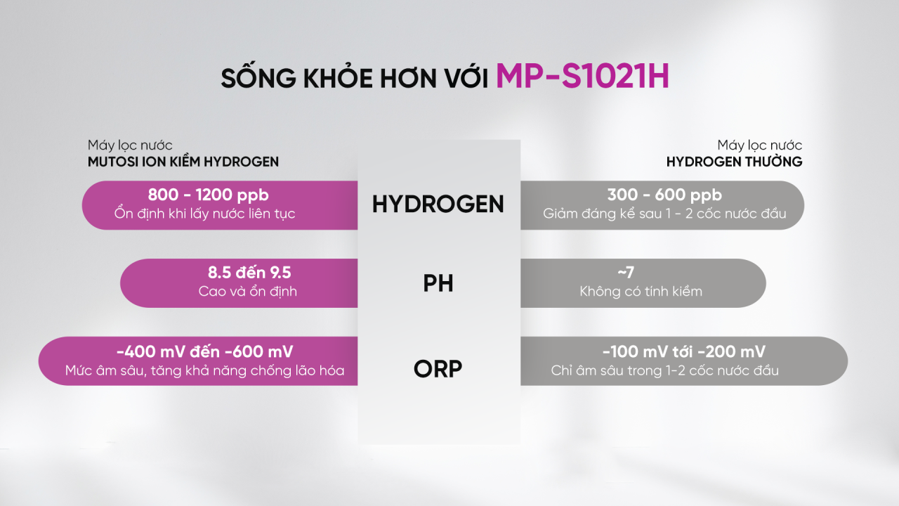 Các chỉ số Hydrogen, pH, ORP trong nước của Máy lọc nước Mutosi ION Kiềm Hygrogen MP-S1021H cao và ổn định hơn so với Máy lọc nước Hydrogen thường.